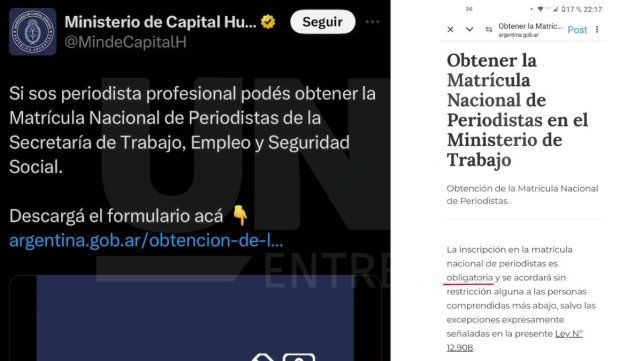 Mediante las redes sociales, la cartera informó: "Si sos periodista profesional, podés obtener la Matrícula Nacional de Periodistas de la Secretaría de Trabajo, Empleo y Seguridad Social". Allí se adjuntaba un link al sitio donde se establecía que la matrícula es "obligatoria" aunque, ahora, la página está caída.