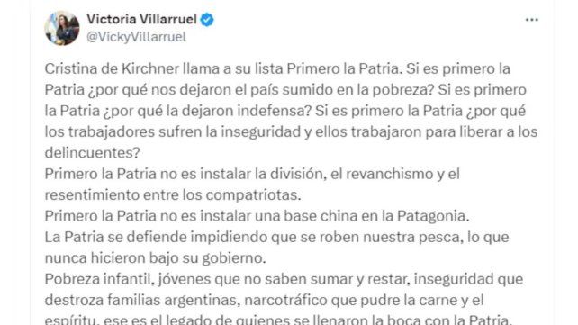 El descargo de la dirigente libertaria con respecto a la candidatura de CFK fue a través de un posteo en sus redes sociales. El texto comenzó con una breve explicación: “Cristina de Kirchner llama a su lista Primero la Patria”, introdujo Villarruel sobre quién se presentará en las urnas el próximo 17 de noviembre para ser una de las protagonistas del peronismo para el futuro cercano.