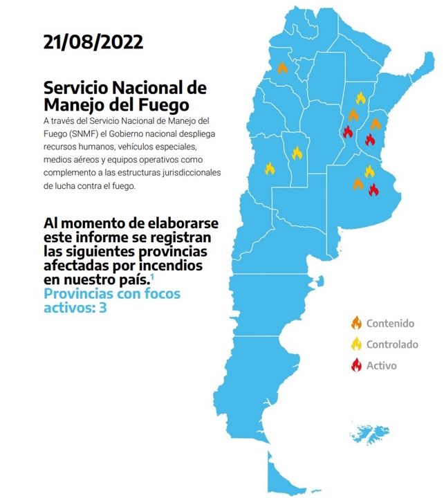 Otras provincias con incendios contenidos es Catamarca -Ambato (Loma Larga) y El Alto (Es Nuestro)-, y en la provincia de Mendoza estaba controlado el que afectaba el departamento de San Rafael (Arroyo Los Patos).