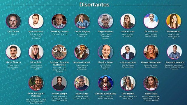 También participarán como oradores del encuentro: Mariano Filarent, Head of Agencies South Cone de Facebook; Michelle Ruíz, LinkedIn Client Partner Lead en IMS; Martín Simarro, Research & Insight Analyst en IMS; Eliana Vidal, Account Strategist Mid-Market Sales en Google Customer Solutions; Santiago González Bustamante, Account Manager en Google Customer Solutions; Federico Rey Lennon, Doctor en Comunicación; Cecilia Hugony, fundadora de RealCX; Carlos Mazalán, presidente de Mazalán Comunicaciones y Fernando Arocena, Director en Mazalán Comunicaciones, entre otros.
