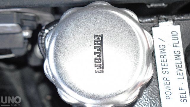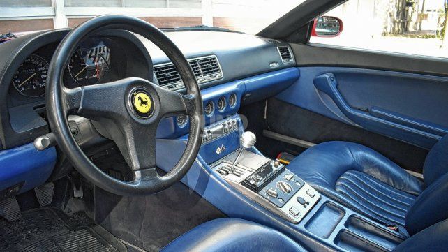 El interior del auto reluce con su tapizado de cuero color azul, el tablero con el distintivo del cavallino y la caja de cambios de seis velocidades cromada.