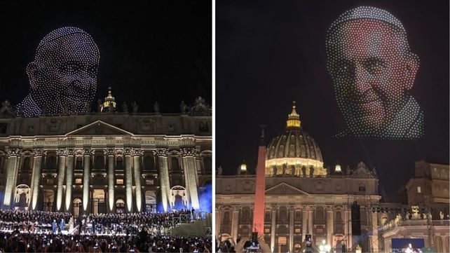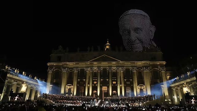 Mientras las notas se extendían sobre la plaza, más de 3.500 drones dibujaron la cara del papa argentino en el cielo nocturno. La imagen fue símbolo de esperanza y unidad en tiempos atravesados por conflictos bélicos y tensiones sociales.