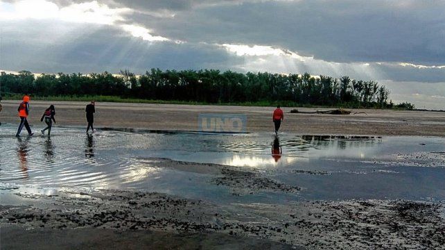 Los bancos de arena dominan el paisaje. Remeros deportivos llegaron a pasar caminando por encima de ellos y cruzaron de la isla Curupí a la isla Puente y volvió a quedar al descubierto el manto geotextil de hormigón y alambre que cubre al Túnel Subfluvial.