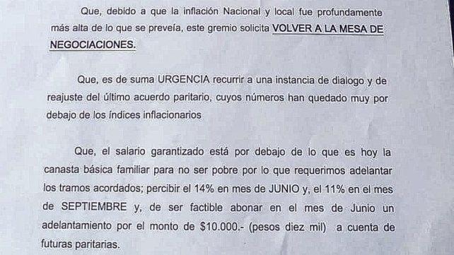 "Es de suma urgencia recurrir a una instancia de diálogo y reajuste del último acuerdo paritario, cuyos números han quedado muy por debajo de los índices inflacionarios", se añadió en el pedido oficial.