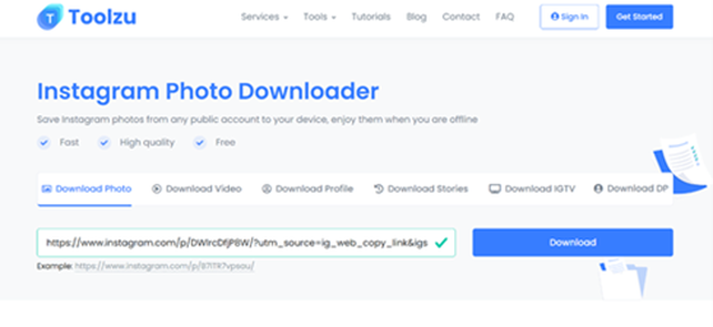 El descargador de Instagram de Toolzu permite a los usuarios descargar fotos, videos, Reels, Stories, IGTV y contenido multimedia del perfil de Instagram directamente a un dispositivo desde la web, sin necesidad de instalar una aplicación ni crear una cuenta. solo pega la URL de Instagram en la interfaz de la herramienta y descarga el contenido.