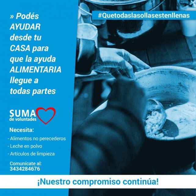 "La solidaridad aparece como protagonista, es el articulador social mientras nos pensamos como comunidad, es mucha la gente que se está sumando a ayudar, armando colectas. Somos muchos los que estamos trabajando para tratar de paliar esta situación. Es un trabajo colectivo, que estamos tirando todos para el mismo lado. Los primeros que entendieron que acá nadie se salva solo, son los habitantes de los barrios", argumentó Anabella Albornoz de Suma de Voluntades.