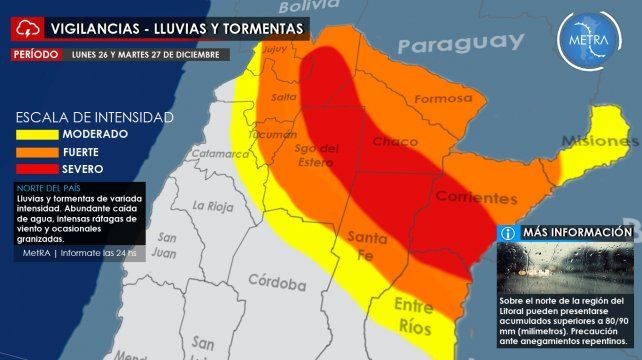 Se espera que en lo que resta del día Lunes 26 y durante el Martes 27 de Diciembre, tenga lugar sobre las zonas marcadas, el desarrollo de tormentas de variada intensidad. Especialmente sobre el norte de Santa Fe, Sgo del Estero, Chaco y Corrientes, algunas de estas tormentas pueden ser muy fuertes o severas, con intensas ráfagas de viento (algunas dañinas), abundante caída de agua (torrenciales lluvias), gran actividad eléctrica y ocasionales granizadas de variados tamaños (ambiente sumamente inestable).