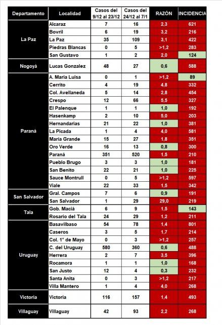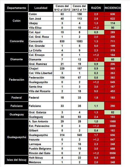 Concordia y Gualeguaychú tienen la mayor incidencia, mientras que San Salvador tiene la mayor razón, debido a que allí comenzaron a crecer los contagios en los últimos días luego de tener pocos casos durante toda la pandemia.