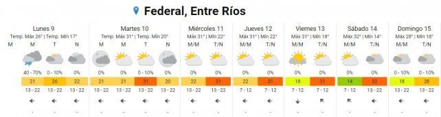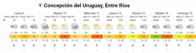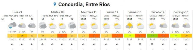 En lo que respecta a Concordia si bien hoy el día se caracterizará por presentarse mayormente nublado y con algunas lluvias aisladas, desde el martes al viernes la máxima oscilará los 31° donde se mantendrá nublado parcialmente.