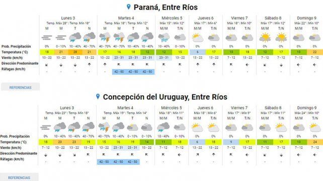 Por un lado, rige un alerta para la noche de este lunes en los departamentos Colón, Gualeguaychú, Islas del Ibicuy, Tala y Uruguay. Por otro lado, rige otro alerta para la madrugada del martes en Concordia, Federación, Federal, Feliciano y San Salvador.
