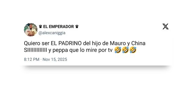 Todo ocurrió el sábado por la noche, cuando el hijo de Mariana Nannis y Claudio Paul Caniggia publicó en X (antes Twitter) un mensaje que rápidamente sumó cientos de miles de visualizaciones. "Quiero ser EL PADRINO del hijo de Mauro y China. Y Peppa que lo mire por TV", escribió desde su cuenta, donde se hace llamar El Emperador. El comentario, irónico y provocador, fue leído como una nueva referencia directa a Wanda (a quien él mismo rebautizó "Peppa" en publicaciones previas) justo cuando la conductora de MasterChef Celebrity (Telefe) analiza volver a iniciar acciones legales por sus expresiones despectivas. Lejos de bajar el tono, Caniggia redobló la apuesta involucrando a Icardi, a su actual pareja y, de manera indirecta, a su ex esposa.