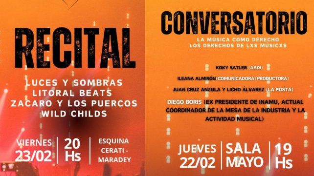 - Jueves 22/02 a las 19: Conversatorio “La música como derecho / Los derechos de lxs músicxs”. Hall de la Sala Mayo. Con la presencia de Gustavo “Koky” Satler (AADDI), Juan Cruz Anzola y Lisandro Álvarez (integrantes de la banda de rock La Posta), Ileana Almirón (comunicadora y productora cultural y musical) y Diego Boris (ex presidente de INAMU y actual Coordinador de La Mesa de la Industria y la Actividad Musical).