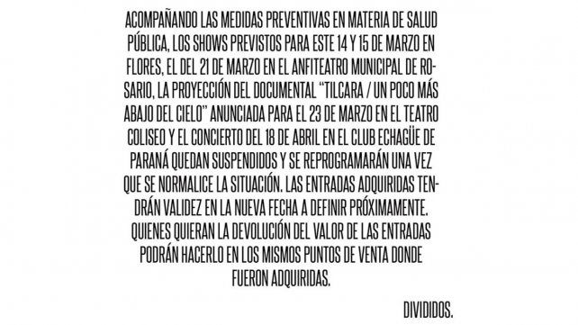 La banda emitió un comunicado por el cual informa la suspensión hasta nuevo aviso de todas las fechas programadas en marzo.