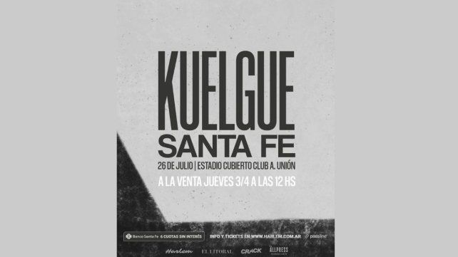 El recital de El Kuelgue en Santa Fe se perfila como uno de los eventos más esperados del año. Las entradas saldrán a la venta el jueves 3 de abril a las 12 horas a través de www.harlem.com.ar, y se podrán adquirir desde 35.000 pesos más el correspondiente service charge. Los fanáticos tendrán la posibilidad de abonar sus entradas en hasta 6 cuotas sin interés con tarjetas de crédito de Banco Santa Fe o Banco Entre Ríos. También se podrán comprar en efectivo, sin costo de servicio, en la Tienda del Club Unión, ubicada en Avenida López y Planes 3553, de lunes a viernes de 11 a 19 hs y los sábados de 10 a 14 hs.