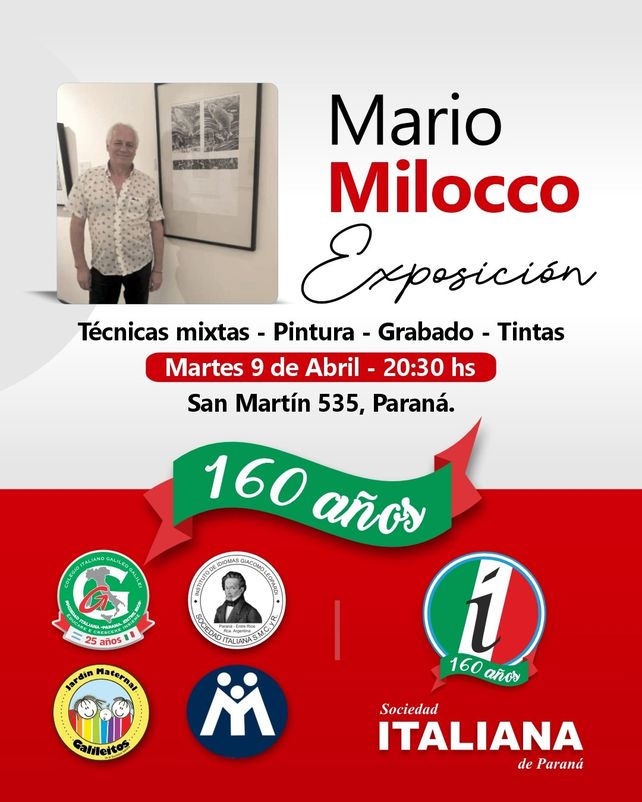 La Sociedad Italiana de Socorros Mutuos Cultural y Recreativa de Paraná llevará acabo, en el marco de los festejos por su 160 Aniversario, la muestra del artista visual Mario Milocco que quedará expuesta a partir del próximo martes 9 a las 20.30 en su sede social de San Martín 535, en Paraná.