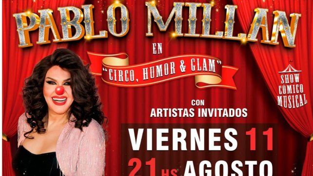 Pablo Millán presenta Circo, Humor y Glam este viernes 11 a las 21 en el Teatro 3 de Febrero. Platea y Palcos Bajos: $2.500 - Palcos Altos: $2.300 y Tertulia: $2.000. Con bono en platea: $2.500.