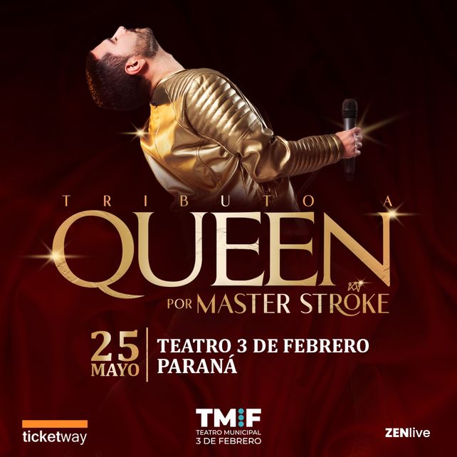 Queen por Master Stroke, llega al escenario del Teatro 3 de Febrero de Paraná con un show imperdible, el sábado 25 de mayo a las 21. Las entradas ya están disponibles en TicketWay y boletería del teatro.