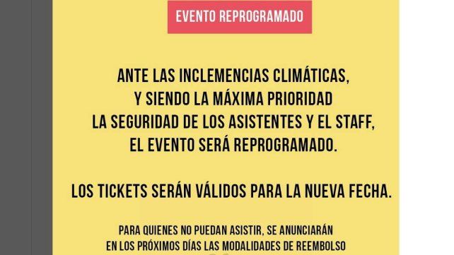 En el corto comunicado, la organización expresó: "Ante las inclemencias climáticas, y siendo la máxima prioridad la seguridad de los asistentes y el staff, el evento será reprogramado. Los tickets serán válidos para la nueva fecha. Para quienes no puedan asistir, se anunciarán en los próximos días las modalidades de reembolso".