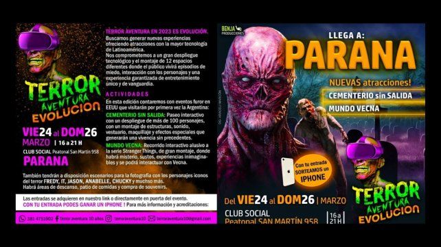 Nuevas experiencias a través de atracciones con la mayor tecnología de Latinoamérica es la propuesta denominada Terror Aventura Evolución, que llega hoy a Paraná. Será en el Club Social, en peatonal San Martín, de 16 a 21.