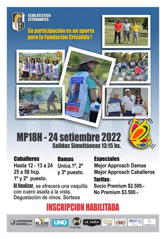 Este sábado se llevará a cabo en el Club Atlético Estudiantes de Paraná el segundo torneo abierto de golf a total beneficio de la Fundación Crisálida de Entre Ríos. El evento comenzará a las 13.15 y se organiza en base a un grupo de empresarios que colaboran con la Fundación, haciendo distintas acciones, depósitos de dinero y la colaboración de más de 120 o 140 jugadores que pagan una inscripción que va destinada a Crisálida.
