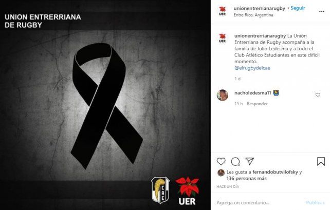 A raíz del fallecimiento de Julio Ledesma, distintas entidades comunicaron sus condolencias a su familia y amigos. Los clubes de la provincia, de otros puntos del país y la Unión Entrerriana de Rugby publicaron en las redes sociales su pesar y el acompañamiento a su esposa Silvia y a sus hijos Sabrina e Ignacio. También lo hizo el Iafas, donde Julio trabajó durante muchos años.