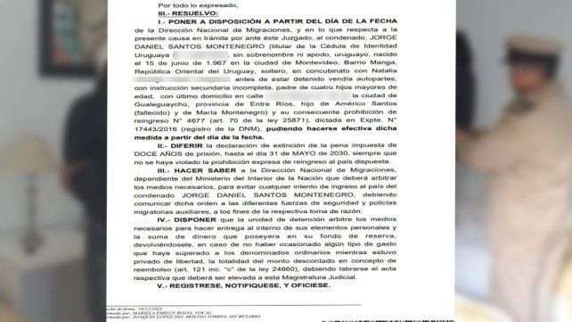 Jorge Daniel Santos Montenegro, condenado en Entre Ríos por narcotráfico y lavado de dinero, pagó 15 millones de pesos y fue expulsado hacia la República Oriental del Uruguay, con prohibición de ingreso al país. Según registró UNO, la medida la dispuso el Tribunal Oral Federal de Concepción del Uruguay el 18 de diciembre a solicitud de la defensa del condenado, de 59 años, quien abonó la mitad de la multa de 30 millones impuesta en 2022 por el mismo tribunal. El hombre lideraba "la banda de los uruguayos", dada la nacionalidad casi todos sus integrantes.