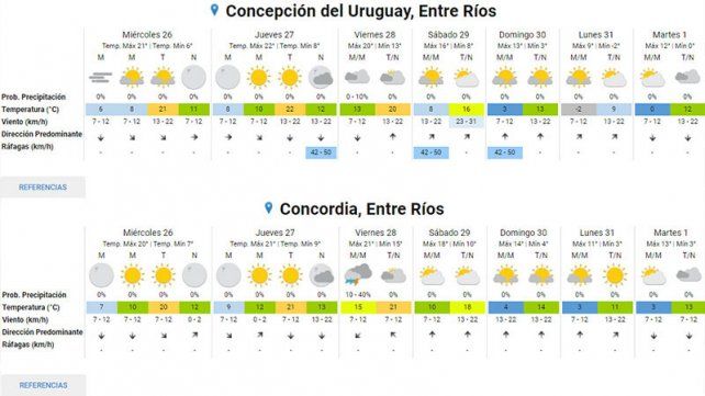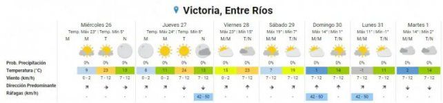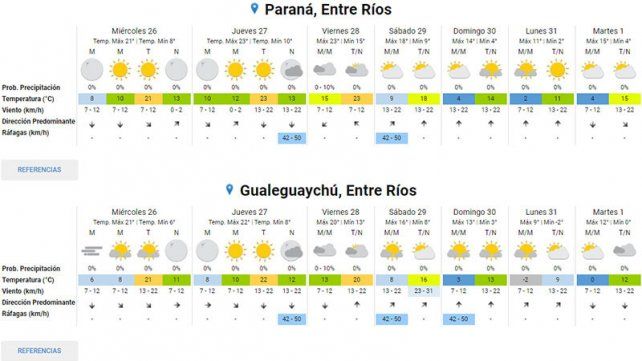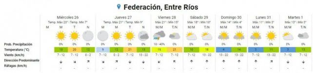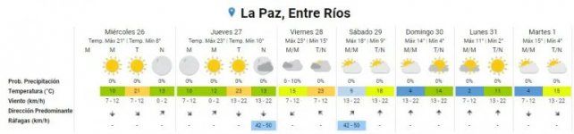 En tanto para este miércoles se aguardan temperaturas mínimas de 6 grados y máximas de 21, para mañana jueves mínima de 10 y máxima de 23, viernes con mínima de 15 y máxima de 23 y sábado con mínima de 9 y máxima de 18. Ya el domingo, como mencionamos anteriormente, la ola polar comienza a instalarse en la región y en la capital entrerriana la mínima será de 4 y la máxima de 14