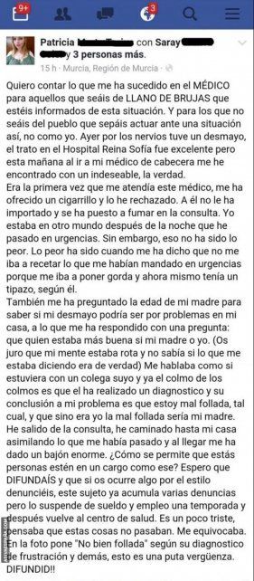 Autoridades sanitarias de Murcia, en el sureste de España, investigan a un médico por diagnosticar a una paciente como "no bien follada" luego de hacerle diversas insinuaciones.