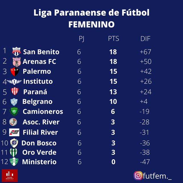 El Torneo "Vivas las queremos" de la Liga Paranaense de Fútbol Femenino, tuvo su sexta fecha este domingo. Los dos equipos que lideran la tabla de posiciones son San Benito y Arenas FC, con 18 puntos ambos.