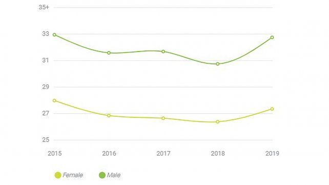 Esto se puede observar en el siguiente gráfico, donde se muestra la tendencia de edades utilizadas en las publicidades entre hombres y mujeres en los últimos cinco años.