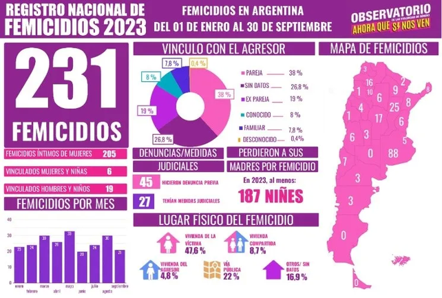 Según su último informe, en nuestro país, del 1 de enero al 30 de septiembre de 2023 hubo 231 femicidios. Esto se traduce en un femicidio cada 28 horas en lo que va del año. En Entre Ríos hubo seis femicidios.