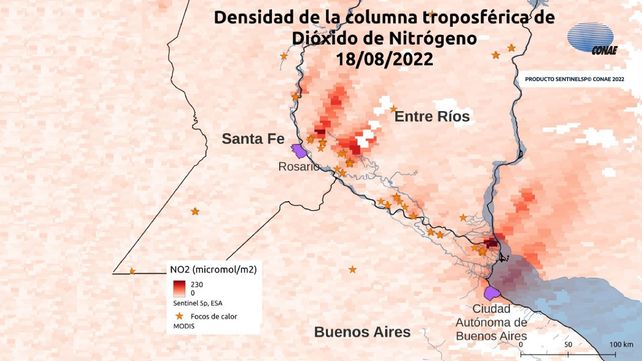 El primero de esos mapas muestra la densidad de la columna troposférica de dióxido de nitrógeno, con valores de hasta 230 micromol/m2 registrados frente a la ciudad de Rosario y hacia el norte bonaerense, donde también se ven focos de calor, señalados con estrellas amarillas.