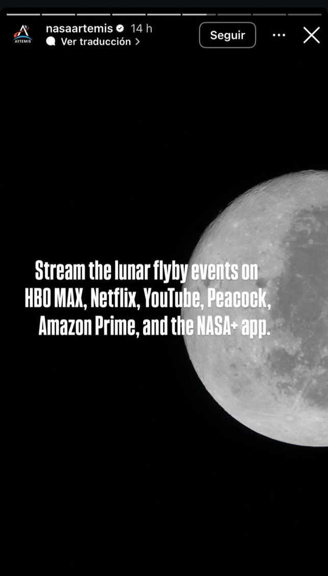 Asimismo, la cuenta oficial de Instagram de la misión de Artemis II de la Nasa, comunicó que plataformas como Amazon Prime, HBO Max, Peacock, HBO Max y la aplicación Nasa+ también transmitirán en vivo el sobrevuelo lunar.