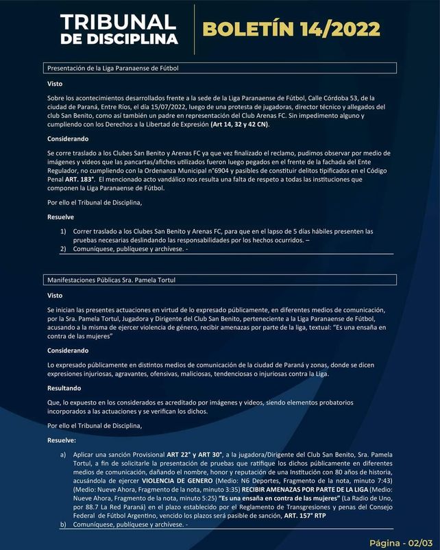 El boletín donde sancionan a Pamela Tortul