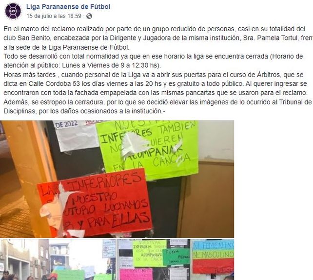 La Liga Paranaense de Fútbol se encuentra envuelta en una situación de violencia de género donde desde la máxima autoridad apuntaron directamente a Pamela Tortul, jugadora de San Benito, por los reclamos que realizaron en la puerta del ente regulador hace dos semanas donde estuvieron jugadoras del Santo y Arenas FC.
