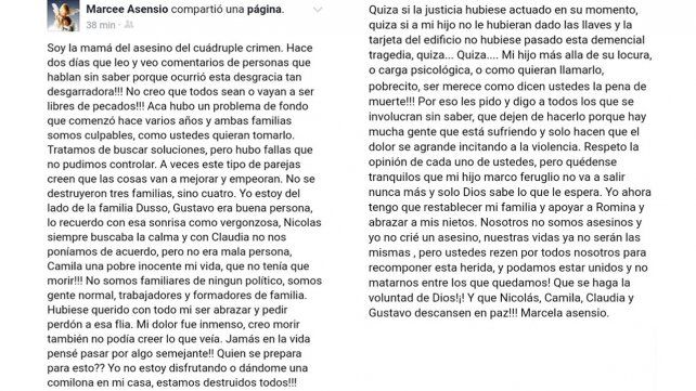 "Soy la mamá del asesino del cuádruple crimen. Hace dos días que leo y veo comentarios de personas que hablan sin saber porque ocurrió esta desgracia tan desgarradora!!! No creo que todos sean o vayan a ser libres de pecados!!! Acá hubo un problema de fondo que comenzó hace varios años y ambas familias somos culpables, como ustedes quieran tomarlo. Tratamos de buscar soluciones, pero hubo fallas que no pudimos controlar", escribió en su perfil de Facebook Marcee Asensio.