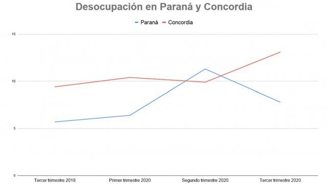 El informe del Indec también revela la situación del empleo en Paraná y Concordia, los dos aglomerados urbanos que mide el organismo nacional. Los números reflejan que en la capital provincial hubo una disminución de la desocupación con respecto al segundo trimestre de 2020, mientras que en Concordia aumentó. Pero comparado con el tercer trimestre de 2019 –en el lapso de un año– hubo un aumento en ambas ciudades.