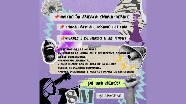 A partir de las 18.30 Las Pachas convocan a una charla debate para tocar temas como derechos de las mujeres, las leyes conseguidas (ESI, IVE, Perspectiva de género), feminismo ambiental, redes de mujeres provincial, qué sucede con el Área de la Mujer y mujeres disidencias y nuevas formas de resistencia, entre otros.