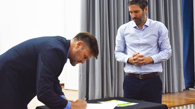 Martín Müller y Sebastián Bértoli, director ejecutivo del Becario, rubricaron el acuerdo mediante el cual se otorgarán formularios especiales a las escuelas que participen del programa piloto de implementación del SAT.