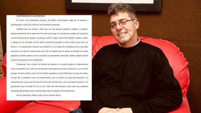 Finalmente, el abogado indicó: "Ciertamente, voy a ejercer mi derecho de defensa en la instancia judicial y administrativa como corresponde pero, como nos encontramos atravesando una instancia electoral y, con el fin de proteger mi buen nombre, he decidido hacer un paso al costado, sin que ello se interprete como un reconocimiento. Por el contrario, lo hago para demostrar a la comunidad que, a pesar que me favorece el principio de inocencia, creo conveniente renunciar a mi postulación como Concejal N° 2 de la Lista 'Más para San Salvador', para evitar que continúen utilizando políticamente estas cuestiones retorcidas en perjuicio de la Democracia".