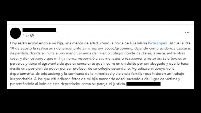 "Están exponiendo a mi hija, una menor de edad, como la novia de Luis 'Pichi' López, al cual el 18 de agosto le realizamos una denuncia junto a mi hija por acoso/grooming", indicó el denunciante y agregó que se dejó como evidencia capturas de pantalla "donde él invita a una menor, alumna del mismo colegio donde da clases, a verse, entre otras cosas y demostrando que mi hija nunca respondió sus mensajes o reacciones a historias". Asimismo, expresó: "Este tipo es un perverso y tiene el agravante de que es consciente que incurre en un delito por ser abogado y que lo hace desde una posición de poder por ser profesor de su colegio secundario".