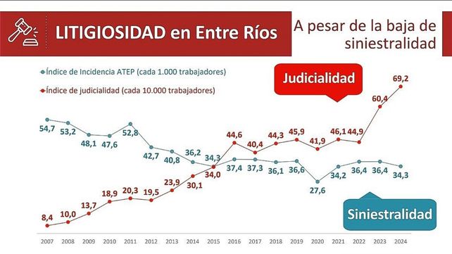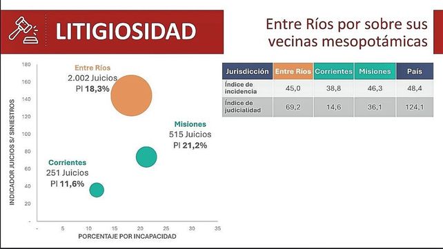 En cuanto a la litigiosidad, fallos relevantes como Crettaz c/Iapser y Vázquez c/Iapser generaron un antes y un después en la litigiosidad laboral de Entre Ríos, que ya se ubica por encima de otras provincias mesopotámicas, como Corrientes y Misiones.
