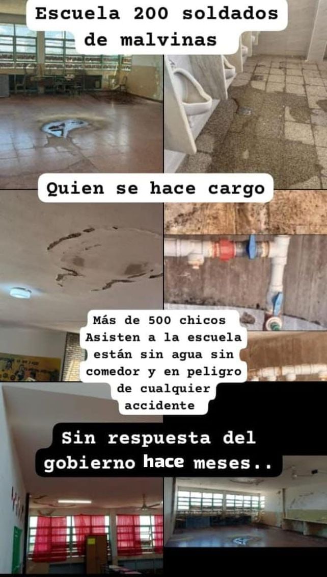 La Escuela "Soldados de Malvinas" N° 200 comenzó el ciclo lectivo con serias dificultades en su infraestructura. Los estudiantes iniciaron las clases sin acceso a agua potable, lo que afecta directamente su salud y el desarrollo de las actividades educativas. La comunidad difundió imágenes que muestran las condiciones en las que los alumnos deben asistir a clases.