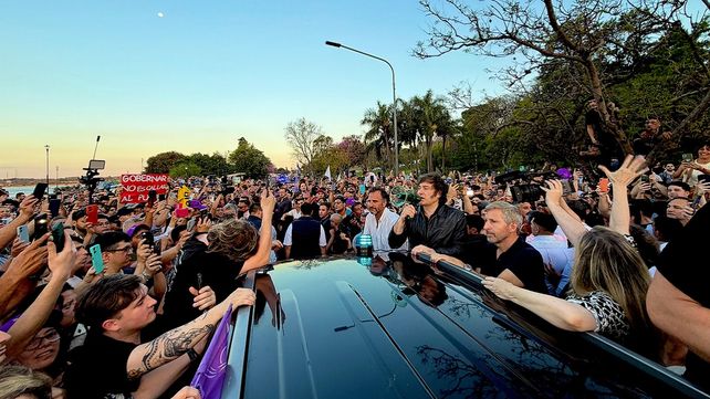 A las 18.43, Milei bajó del vehículo que lo trasladó y saludó a los presentes que vitoreaban “Milei, querido, el pueblo está contigo”. Tiempo después, con un altavoz se dirigió a la militancia y dirigió algunas palabras. Un rato más tarde, apareció Rogelio Frigerio quien los saludó y lo hizo también con Karina Milei.