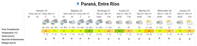 Luego, el domingo persistirán las lluvias aisladas por la madrugada y la mañana en toda la provincia, y el cielo tornará mayormente nublado hacia la tarde y la noche. Las temperaraturas se mantendrán entre 15° y 20°.