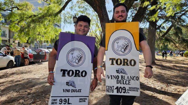 Ángelo, de 23 años, viene de Sunchales, Santa Fe, por primera vez. "La paso bien porque estoy con mis amigos. Suelo escuchar más rock, pero vengo para pasar el tiempo bien", dijo sobre sus expectativas para la noche. Junto a uno de sus compañeros hacía la previa disfrazado de caja de vino.