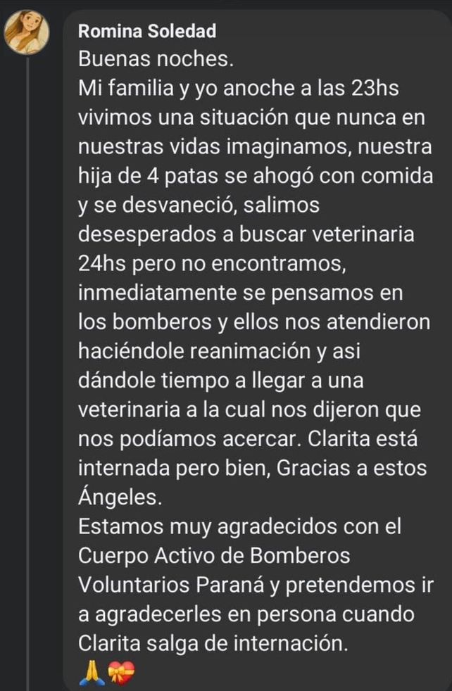 Romina Soledad, dueña de la perra, expresó su agradecimiento: "Mi familia y yo anoche, a las 23 horas, vivimos una situación que nunca imaginamos: nuestra hija de cuatro patas se ahogó con comida y se desvaneció. Desesperados, salimos a buscar una veterinaria abierta, pero no encontramos ninguna. Inmediatamente pensamos en los bomberos, y ellos nos atendieron, realizándole reanimación y dándonos el tiempo necesario para llegar a una veterinaria. Clarita está internada, pero se encuentra bien. Estamos profundamente agradecidos con estos ángeles del Cuerpo Activo de Bomberos Voluntarios de Paraná y esperamos poder agradecerles en persona cuando Clarita salga de internación".