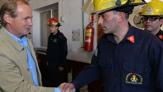 El mandatario estuvo este viernes en Gualeguaychú donde fue recibido por el intendente, Martín Piaggio, y el secretario de Desarrollo Social, Martín Roberto Piaggio, candidato a presidente municipal en las elecciones del 23 de octubre. Visitó el cuartel de Bomberos Voluntarios, y entregó a las autoridades de la Federación Entrerriana el decreto de promulgación de la Ley Nº 11.116, que entre otros beneficios otorga un servicio de salud y un haber jubilatorio a los bomberos voluntarios de la provincia.