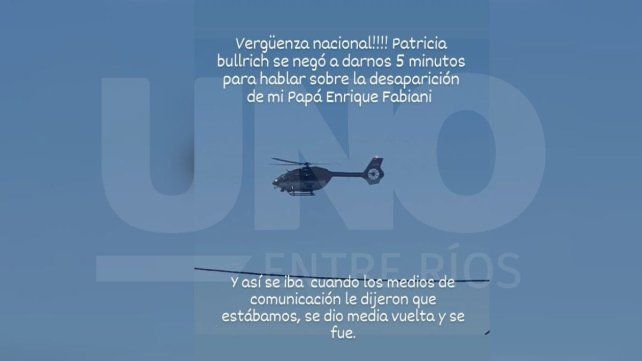 "Vergüenza nacional", expresó Melisa a través de sus redes sociales, "Patricia Bullrich se negó a darnos cinco minutos para hablar sobre la desaparición de mi papá". La mujer adjuntó una imagen donde se ve un helicóptero y agregó: "Así se iba, cuando los medios de comunicación le dijeron que estábamos, se dio media vuelta y se fue".