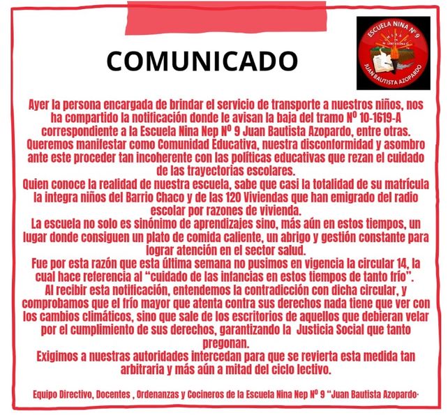Por otra parte exigen que las autoridades provinciales cumplan lo que tanto se pregona. "Exigimos a nuestra autoridad intercedan para que se revierta esta medida tan arbitraria y más aún a mitad del ciclo lectivo".
